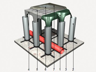Plancher surélévé sur vide sanitaire, en béton armé, grande hauteur, de 100+4 cm de hauteur, sur coffrage perdu de pièces en polypropylène recyclé, appuyé sur des tubes en PVC de 125 mm de diamètre et 85 cm de hauteur, fixés à une matrice de base, réalisé en béton C25/30 (XC1(F); D10; S3; Cl 0,4) prêt à l'emploi, et treillis soudé PAF 10 200x200 mm en acier Fe E 500 comme armature de répartition, placé sur des séparateurs homologués en dalle de compression de 4 cm d'épaisseur; appuyé dans son ensemble sur une base en béton de propreté.