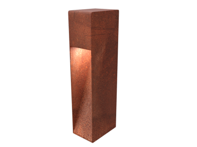 Balise de 1100 mm de hauteur, composée de corps en acier corten de 6 mm d'épaisseur et d'un réflecteur incliné en acier inoxydable AISI 304, avec 3 DEL de 25 W, classe de protection I, degré de protection IP66, fixée sur une base de béton C20/25 (X0(F); D20; S2; Cl 1,0). Comprend les éléments d'ancrage. | ||