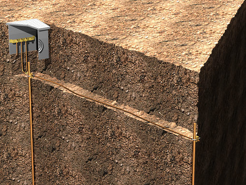 Prise de terre composée de deux piquets en acier cuivré de 2 m de longueur chacun, enfoncés dans le terrain, unis avec câble conducteur en cuivre de 25 mm² de section, connectés à barrette de mesure, dans un regard en polypropylène de 30x30 cm. Comprend le boulon en U pour la connexion du piquet au conducteur de terre et les additifs pour diminuer la résistivité du terrain.